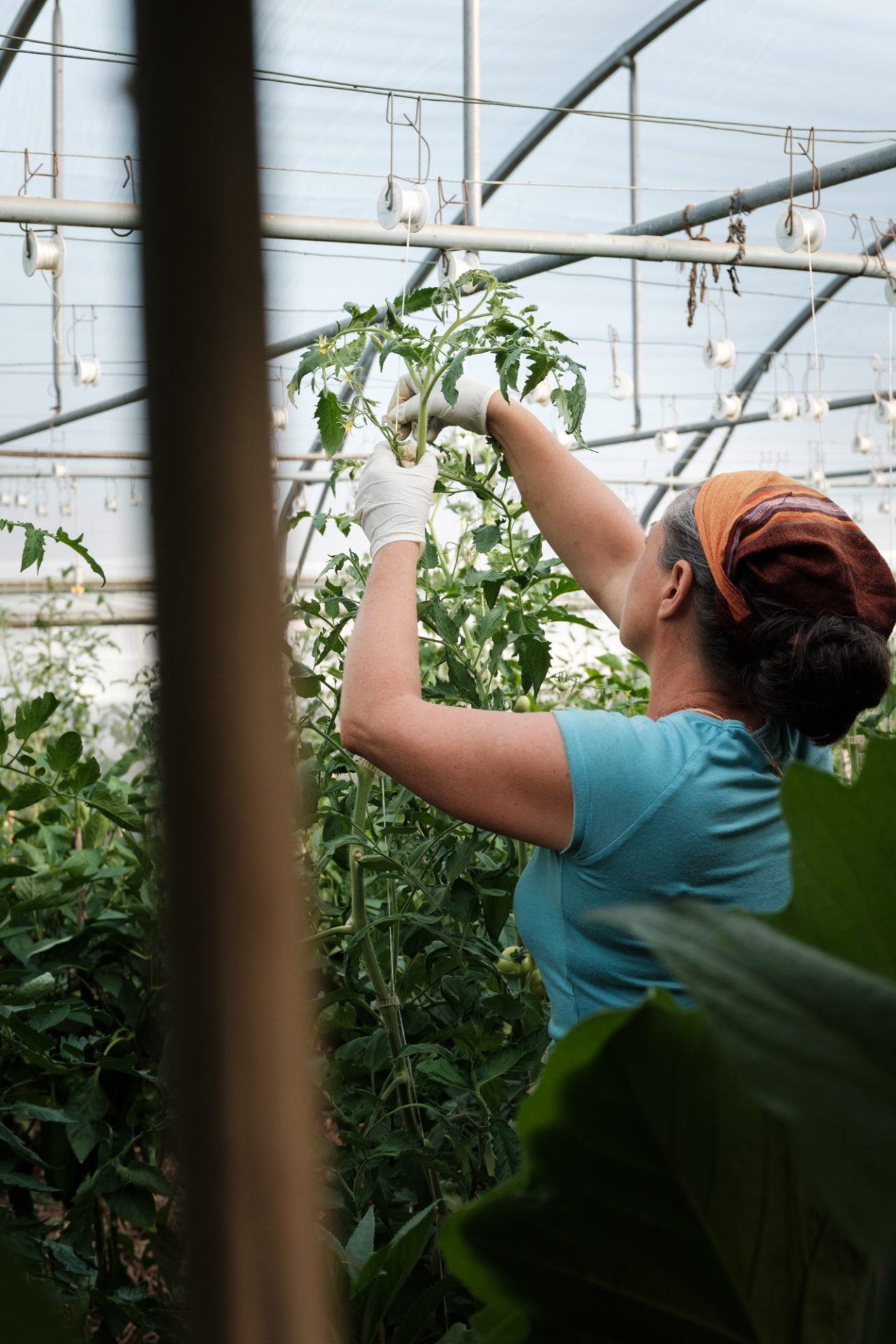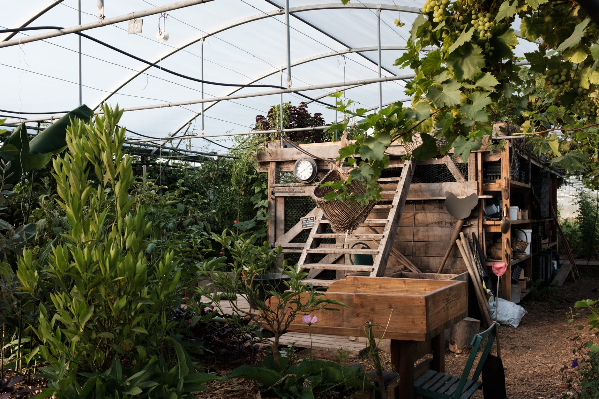 Die Landwirtin schiebt eine Karre voller Triebe und Blä tter in den Hühnerstall, der sich direkt im Gewächshaus befindet. „Die Pflanzen bringen nicht nur Früchte hervor, die wir verkaufen. Vielmehr sind die Pflanzenabfälle auch Futter für unsere Hühner. Sie legen Eier für uns, aber das ist nicht alles. Sie machen auch Kompost, den ich auf die Pflanzen häufle. Das führt zu einem guten Wachstum und hohen Ertragen“, erklärt die Landwirtin.