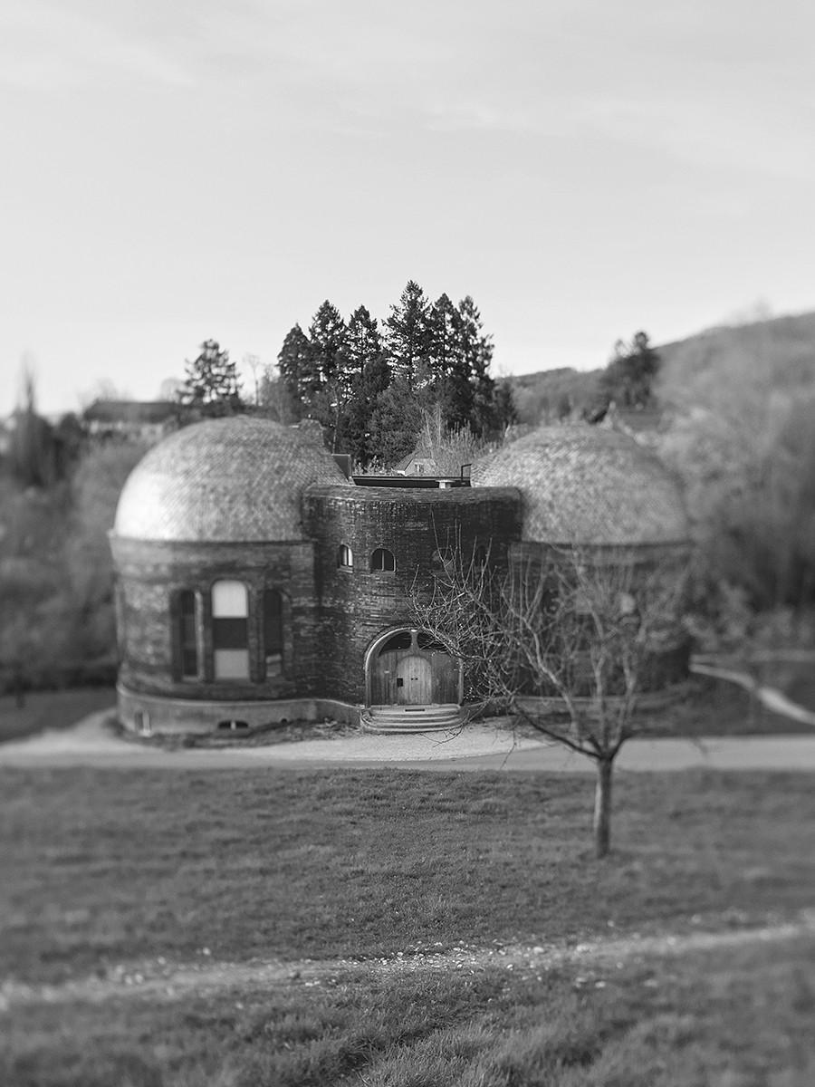 Der gewaltige Bau erhebt sich wie ein riesiger Bienenstock. Das Goetheanum: plastisch modelliert, organische Formen aus grauem, massivem Beton, die Sprache der umgebenden Juralandschaft aufnehmend. Umgeben von einem lebendigen Dorf. Ein Schornstein, der wie eine Blume in den Himmel wächst, Fenster, die sich einander zuneigen, silbergraue Holzschindeln an runden Gebäudeteilen, Dachüberstände in immer neuen fließenden Formen.