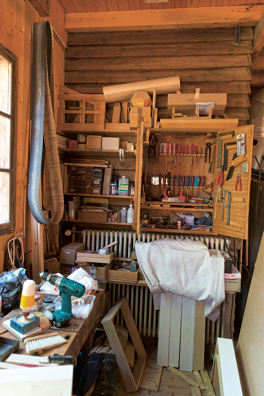 Weiter oben vom Berg hört man leise das Geräusch einer Kreissäge. In der Schreinerei Baukunst entstehen Möbel für alle Lebensbereiche: Kinderstühle, Betten, Tische, Bienenkästen und sogar Urnen aus verschiedenen Hölzern. Und auch an diesem Ort verbinden sich Handwerk und Kunst. Thomas Schär ist Schreiner und Bildhauer. Er sagt: „Für mich ist es eine Selbstverständlichkeit, dass man nicht einfach Kisten baut, sondern sich fragt, in welchem Verhältnis das Möbelstück zum Menschen steht. Es ist doch interessant, überhaupt einmal zu fragen: Was hat der Mensch für eine Beziehung mit einem Stuhl, wenn er sitzt, mit einer Treppe, wenn er hinaufsteigt, mit einem Bett, wenn er darin liegt? In welchen Zustand gerate ich mit diesem Gegenstand, der sich mit mir verbindet?“ Für Thomas Schär ist es wichtig, dass sich Menschen mit ihrer Umgebung verbinden können. Dafür brauche es Zuwendung und Wärme schon bei der Herstellung. „Denn wo Architektur zunächst einen Umraum bildet, kommen Möbel sehr nah an uns heran.