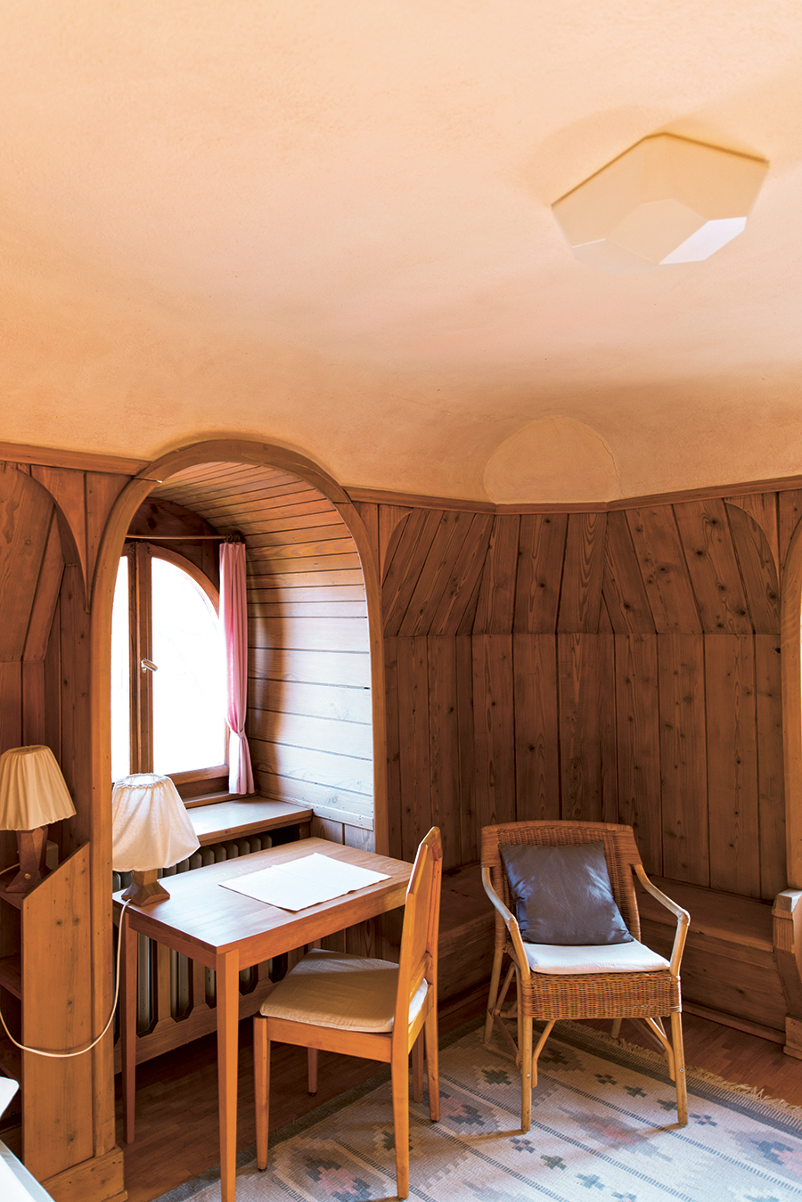 Nebenan im Saal richtet sie Stühle und Tische für eine Studentengruppe, die gleich hier arbeiten wird. Die Wände sind mit Holz vertäfelt, hohe Fenster mit solider Mechanik und Glas, das noch im Sandbett gezogen wurde. Gern würde sie hier modernisieren. „Aber du kannst nicht einfach irgendwelche Möbel hier reinstellen. Das ist man dem Gebäude schuldig.“ In einer Ecke steht ein Exemplar des sogenannten Schreinereistuhls, der nach einem Entwurf von Rudolf Steiner gebaut wurde und so etwas ist wie der Klassiker der anthroposophischen Möbelkunst. Das renommierte Vitra Design Museum widmete sich 2010 mit einer großen Ausstellung dem anthroposophischen Design und setzte die in die Jahre gekommenen Kunstwerke neben zeitgenössische Werken wie etwa den Chair One von Konstantin Grcic. Der Ausstellungskatalog zeigt eine Abbildung des ineinander verschachtelten und von Architekturkritikern gefeierten VitraHauses neben dem Dornacher Transformatorenhaus von 1921, das eine verblüffend ähnliche Formensprache aufweist. Es scheint, als hätten Architekturarchäologen in Dornach einen Teil ihrer DNA wiederentdeckt.