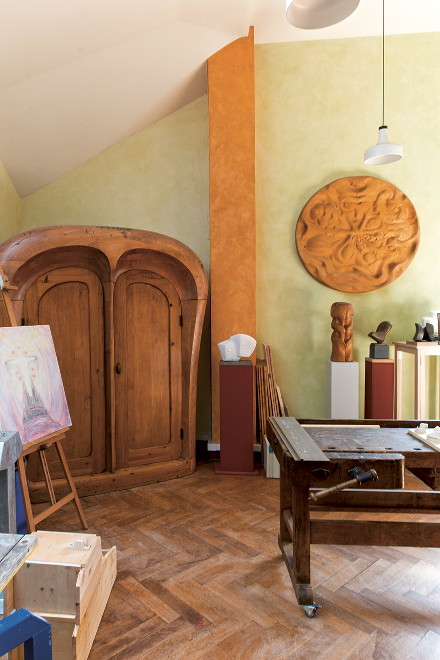 In der Mitte des Büros steht eine Steinplastik eines brasilianischen Studenten. Marianne Schubert plant eine Ausstellung. Drei Schritte weiter entführt der Nachbarraum in die Anfangsjahre des Goetheanumhügels. Die Bildhauerin Edith Maryon lebte hier. Sie ließ die drei sogenannten Eurythmiehäuser errichten als Unterkunft für die vielen Künstler, die aus der ganzen Welt angereist waren, um am Bau des Goetheanums mitzuwirken. Und noch heute wirken die drei Gebäude, die sich in ihren Formen entsprechen, aber doch unterschiedlich sind, als würden sie aus Freude über diese Initiative einen Tanz aufführen.