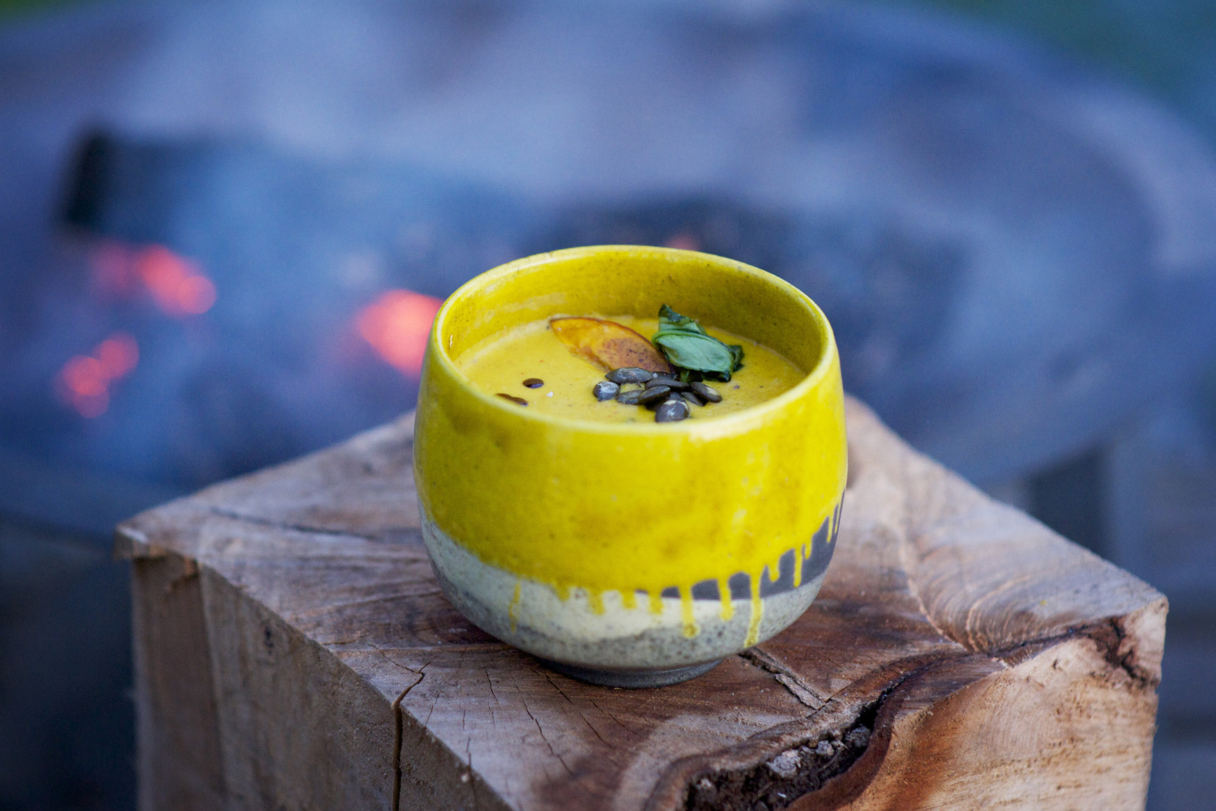 Leckeres Rezept für eine cremige Curry-Gemüsesuppe mit Kürbis, Kartoffeln, Karotten, Pak Choi, gerösteten Kürbiskernen und Kürbiskernöl – würzig, gesund und einfach zuzubereiten.