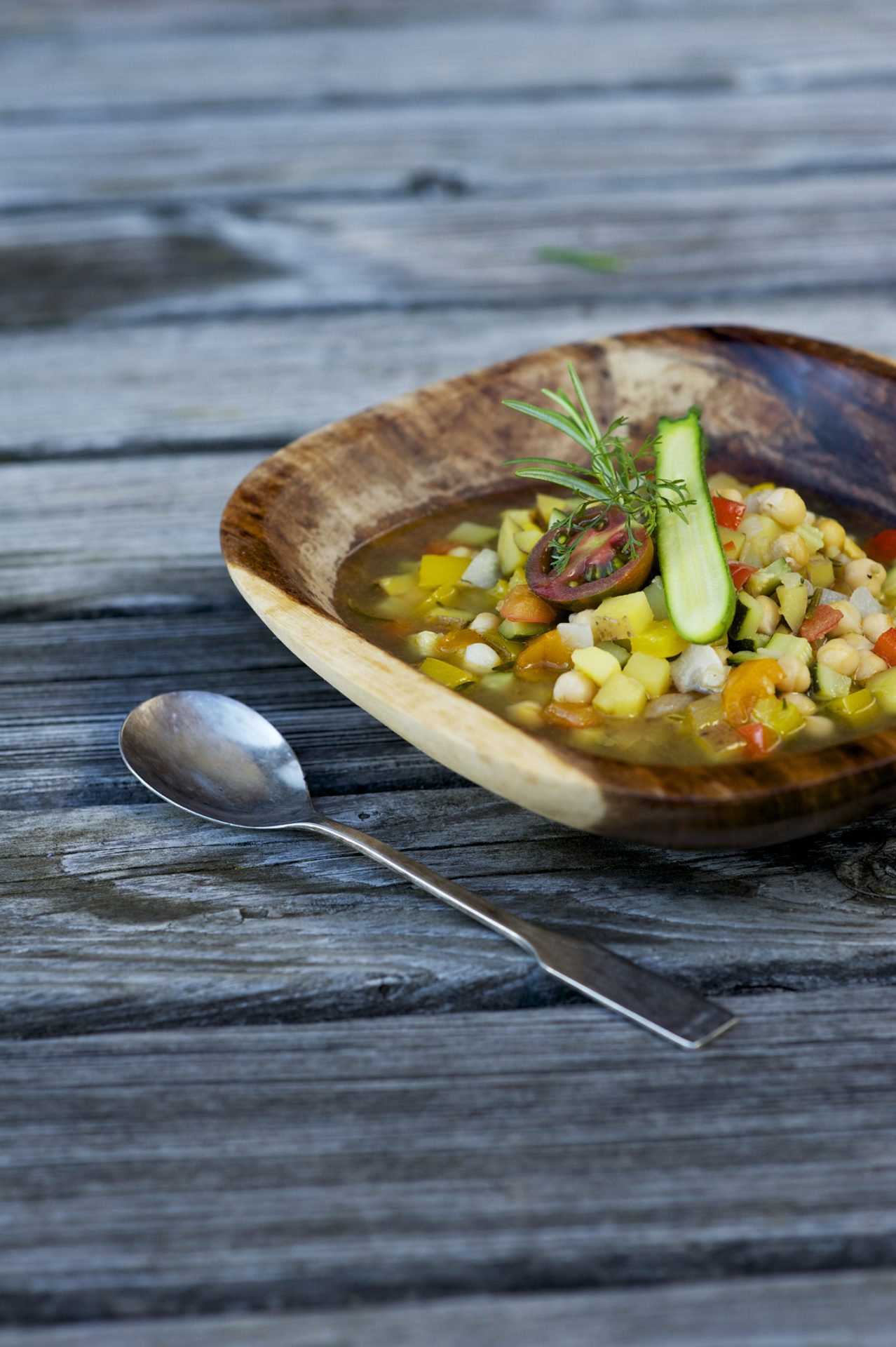 Herzhaftes Rezept für eine gesunde Kichererbsen-Gemüsesuppe mit Kartoffeln, Paprika, Zucchini, Tomaten, Kräutern und Crème fraîche – einfach, nahrhaft und aromatisch.