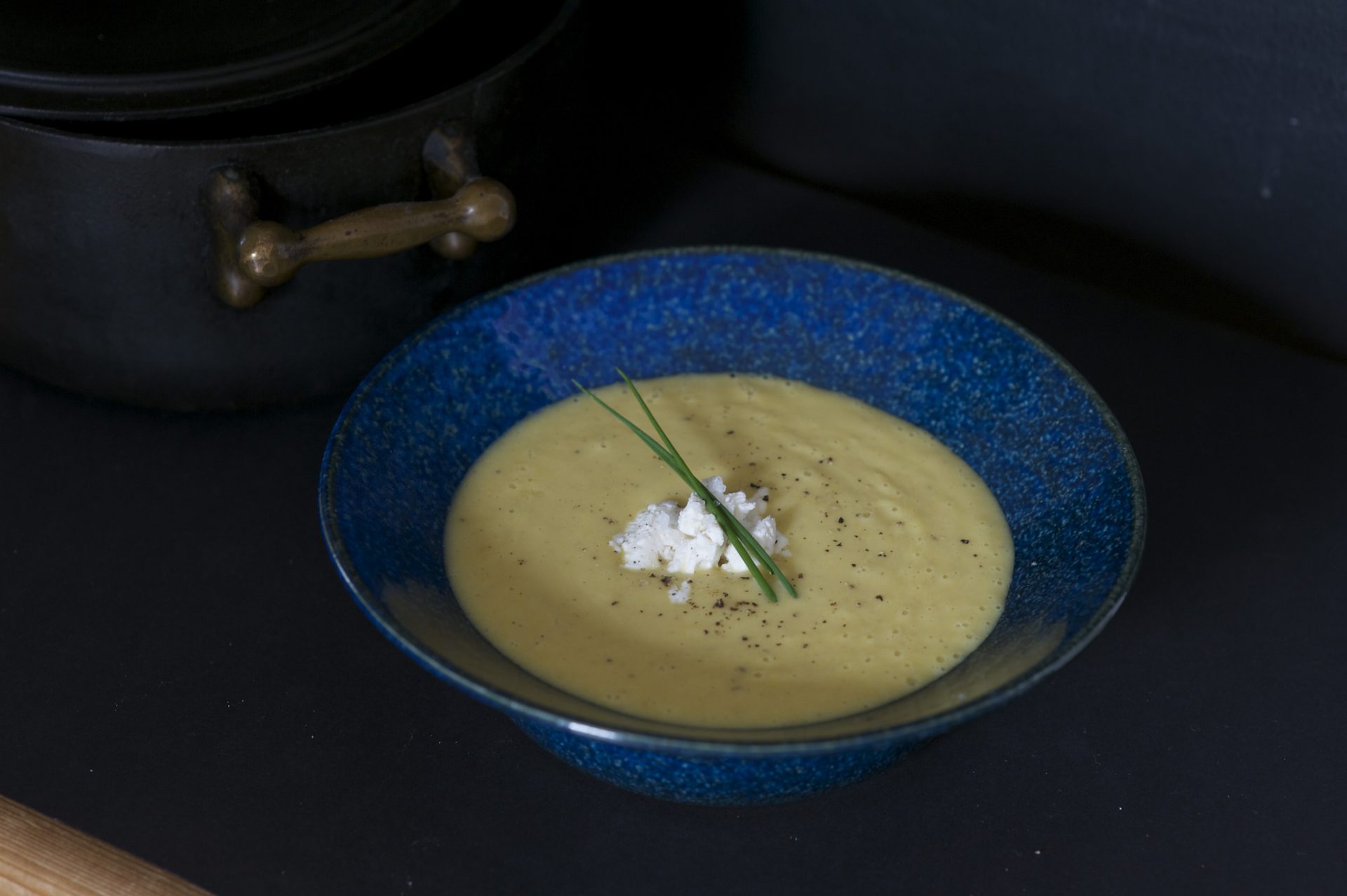 Rezept für ein aromatisches Quitten-Curry: Quitten mit Ingwer, Frühlingszwiebeln und Curry sanft gedünstet, püriert und serviert mit Ziegenfrischkäse, gebratenem Speck und Schnittlauch.