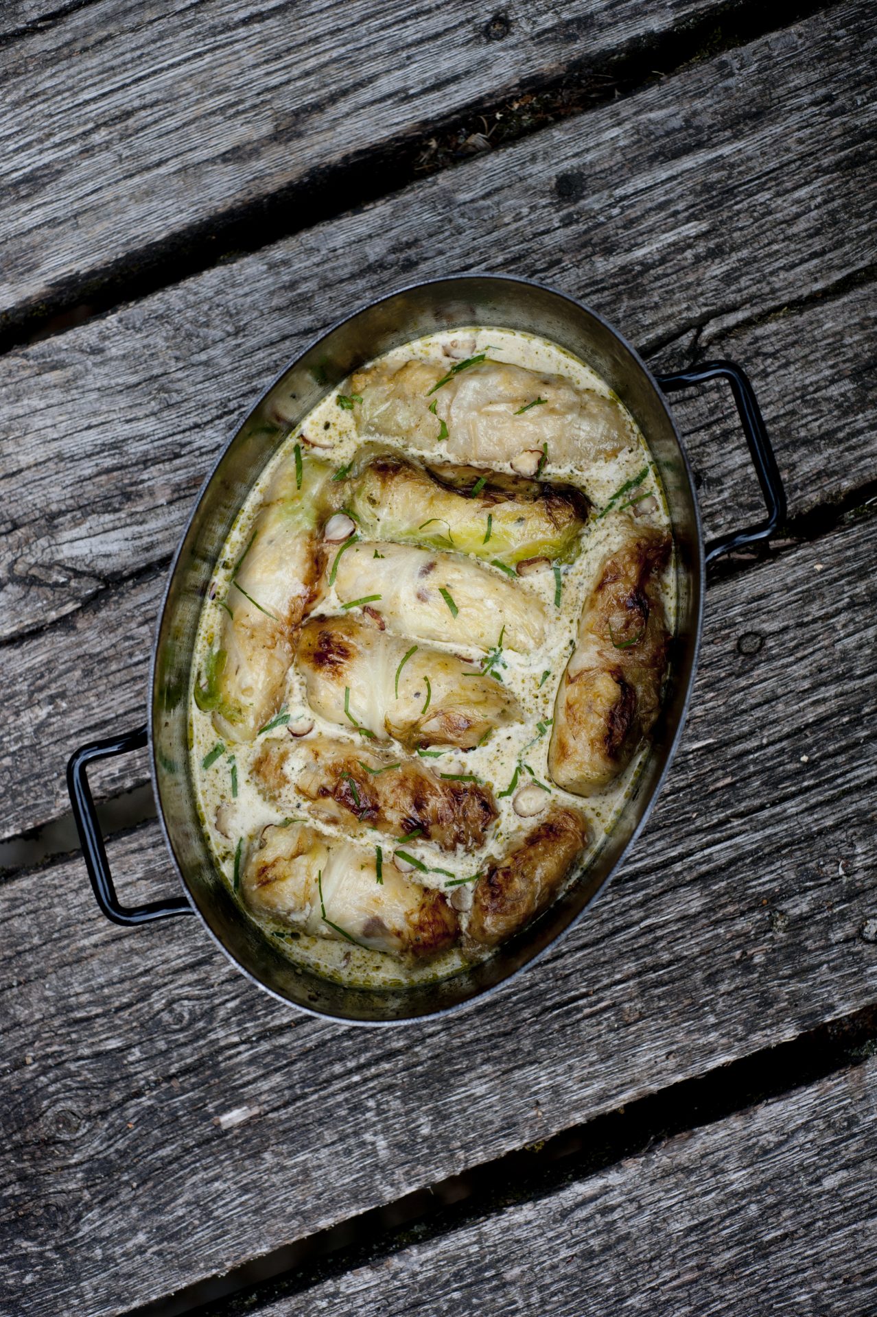 Zarte Spitzkohlblätter gefüllt mit Hirse, Rosinen und Haselnüssen, in Orangensaft geschmort und mit saurer Sahne verfeinert. Leckeres, vegetarisches Hauptgericht.