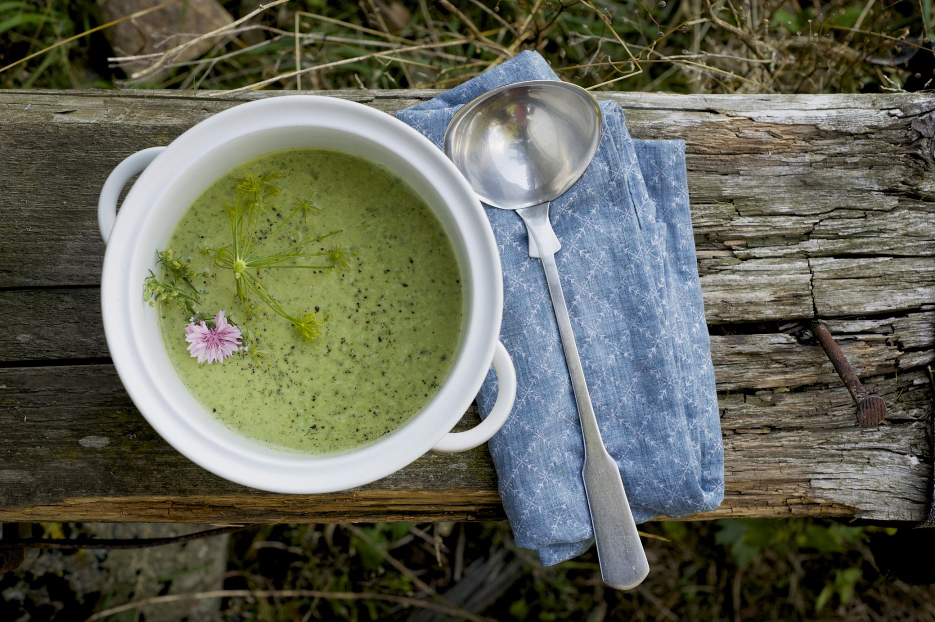 Frisches Rezept für eine gesunde Suppe mit Brennnesseln oder Giersch, Kartoffeln, Karotten, Sahne und essbaren Blüten – nahrhaft, aromatisch und leicht nachzukochen.
