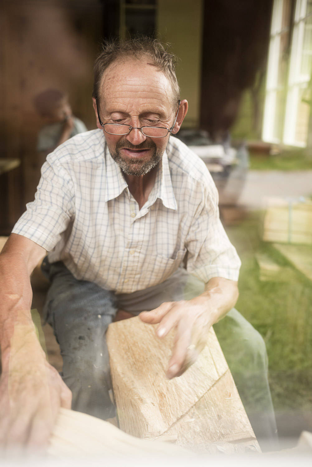 Wir gehen zurück in die Werkstatt. Bis auf das Knistern und Knacken im Ofen ist es ganz still. Emil legt ein Scheit Holz und ein paar aussortierte Schindeln nach. Ich lasse mich ganz auf die Geräusche und Klänge ein. Emil setzt das spezielle Ziehmesser an und beginnt Kerben an der Stirnseite des Holzes zu machen. Diesen Vorgang nennt man bärzen. Anschließend zieht er das Messer scheinbar ohne Mühe durch das ganze Holzscheit hindurch, bis nach unten. Doch sein Gesicht und die Anspannung seiner Muskeln zeigen, dass neben Gespür und Geschicklichkeit auch ordentlich Kraft notwendig ist.