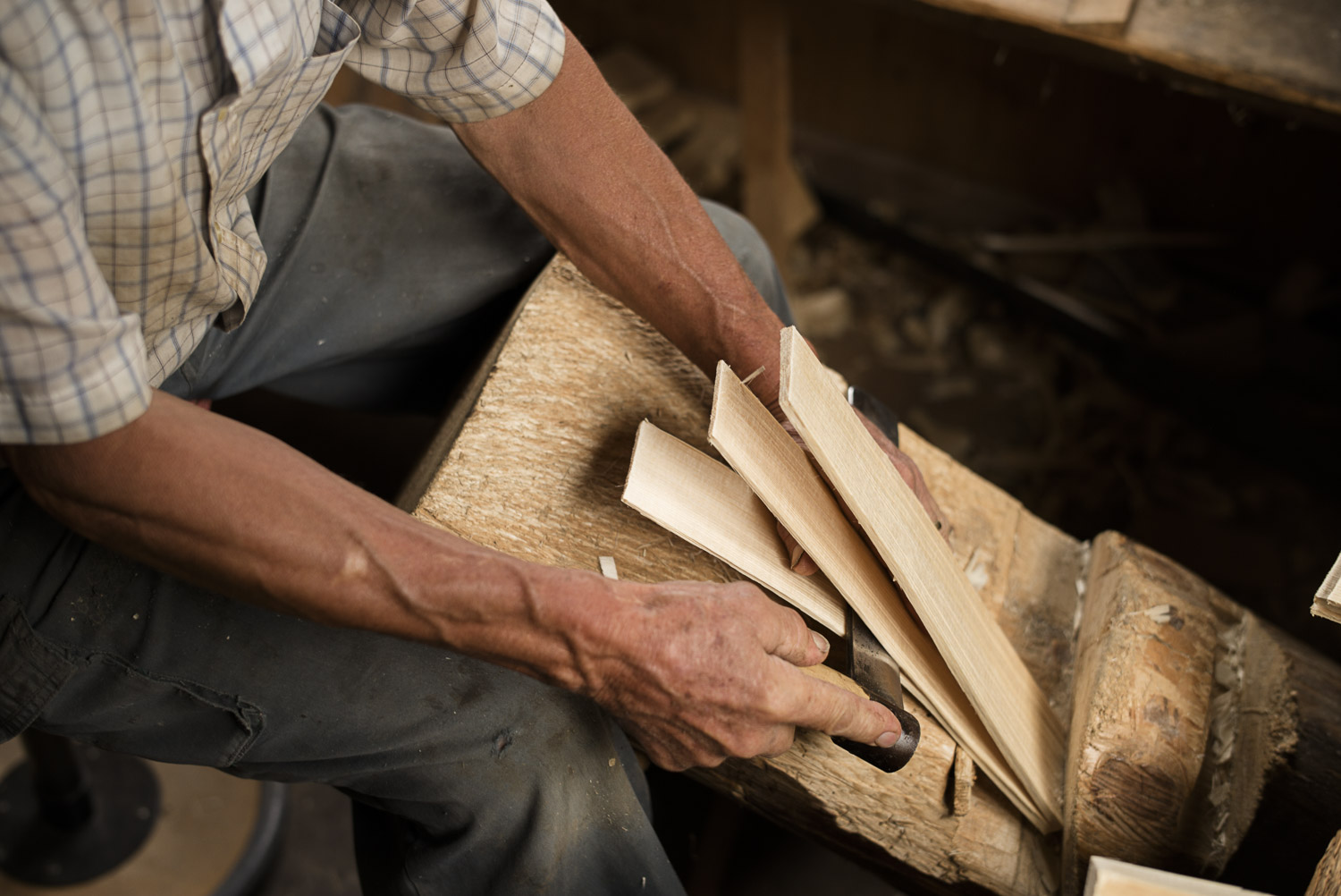 Früher wurde für das Fällen der Bäume sogar auf die Mondphase geachtet. Ist der Baum gefällt, muss sein Stamm erst trocknen. Später wird er in gleich lange Abschnitte gesägt. Diese entsprechen genau der Länge der Schindeln. Die meisten Schindelmacher arbeiten stehend, erzählt der 70-Jährige. Sie spannen das Holzscheit, den Mösel, in einen Schraubstock, bevor sie es mit dem Schindelmesser bearbeiten. Emil hingegen sitzt. Auf einem Hocker, der einem Holzschemel ähnelt. Ein Einschnitt in die Sitzfläche bietet dabei den nötigen Anschlag für das Spalten.
