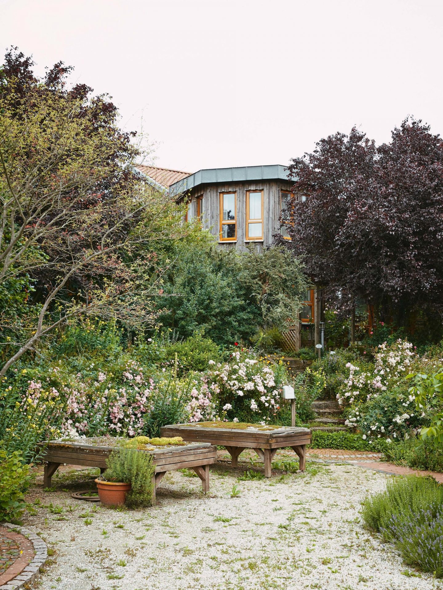Ein ganzheitlicher Denkansatz fördert das funktionierende resiliente Ökosystem. Der Baumbestand wirkt als riesige Sonnenfalle: Kleinwüchsige Sträucher und Bäume wie Aroniabeere, Birne und Apfel im Süden bilden ein Tor für die Sonnenstrahlen, eine natürliche Barriere aus hohen Bäumen wie Kastanien- und Nussbäumen im Norden hält die Wärme im Garten.